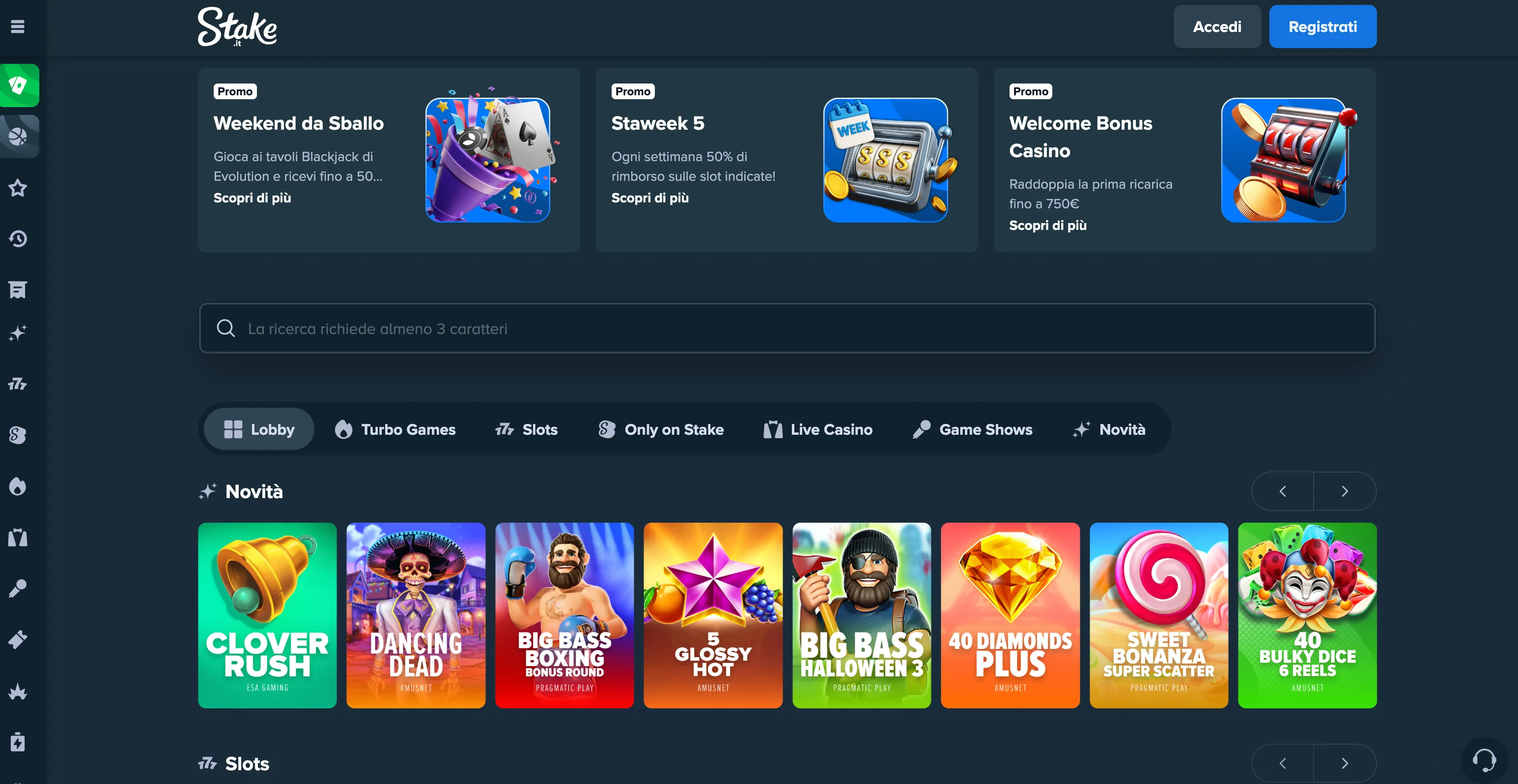 - Oltre 3.500 giochi inclusi slot esclusive Stake Originals